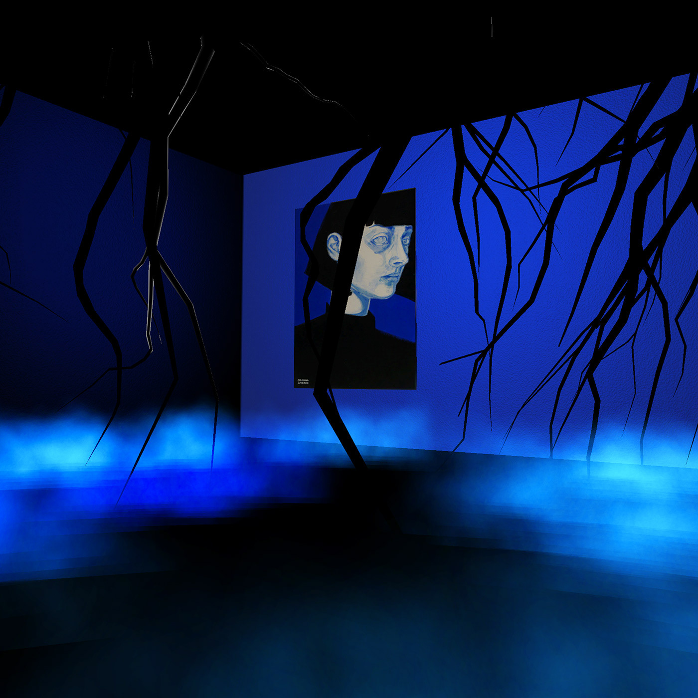 On March 29, 2020, Ambroz's mother passed away. In the painting Nothing Grows but Stings we see the artist's face, frozen in time, a month after the event. The dominant colors here are two: black and blue. The right eye, wide open, looks like the gaze of a statue. A gaze without a specific direction trapped in the inner and inaccessible world of the beholder. The left eye looks at the right eye. It is a tender observer; compassionate and desirous of understanding. This image is reminiscent of Pablo Picasso's 1904 painting Celestine. The monochromatic canvas is held in cool blues depicting the face of the owner of a house of shack in a Barcelona neighborhood, who has one blind eye.